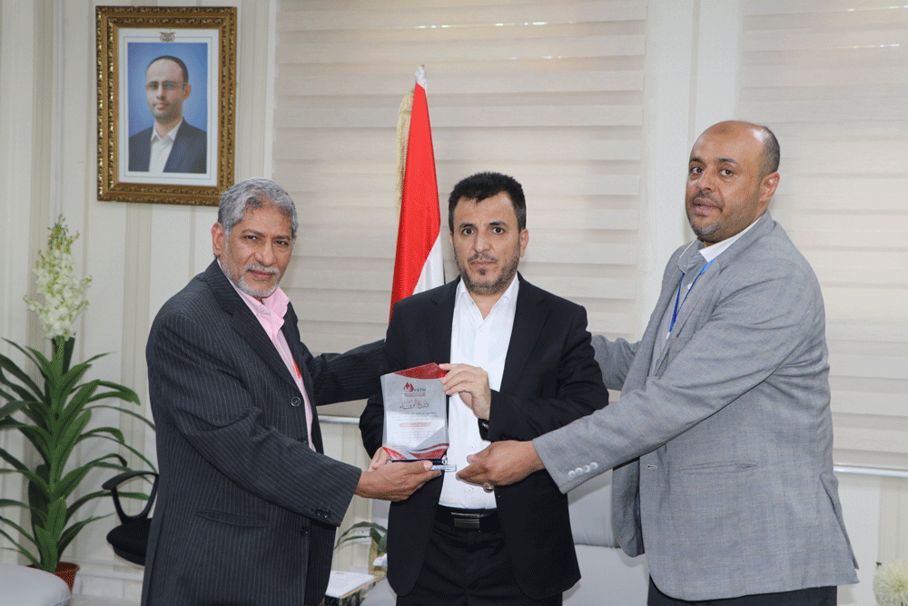 On Tuesday, September 15, 2020, His Excellency Prof. Dr. Taha Ahmed Al-Mutawakel, Minister of Public Health and Population, was honored during a visit by the President of the Yemeni Society for Thalassemia Patients, Dr. Ahmed Shamsan Al-Maqrami, and the General Manager, Mr. Jamil Ali Al-Khayati, to his office at the Ministry.