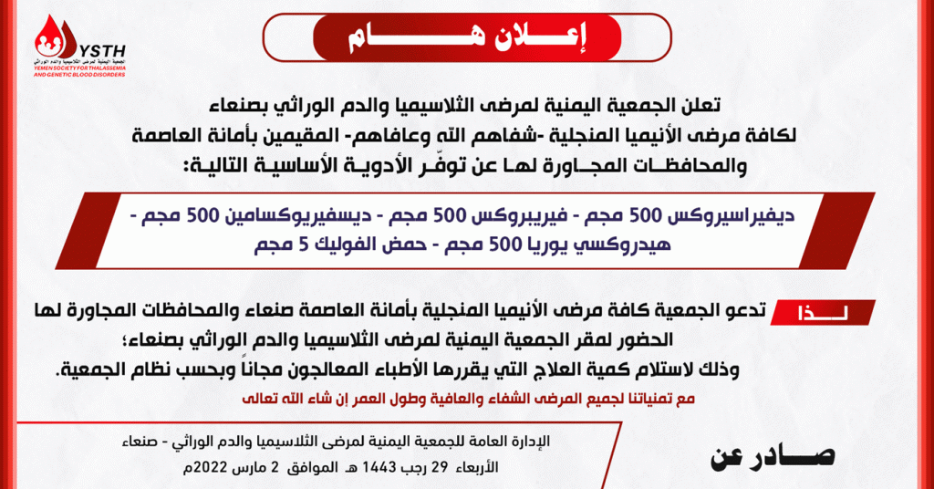 Important Announcement The Yemeni Society for Thalassemia and Hereditary Blood Disorders in Sana’a announces to all patients with sickle cell anemia — may God...