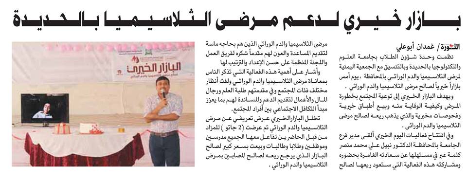 Workshop Sponsored by Bonyan Development Foundation Trains 70 Educators on Thalassemia Risks and Childhood Prevention The Yemeni Society for Thalassemia and Hereditary Blood Disorders...