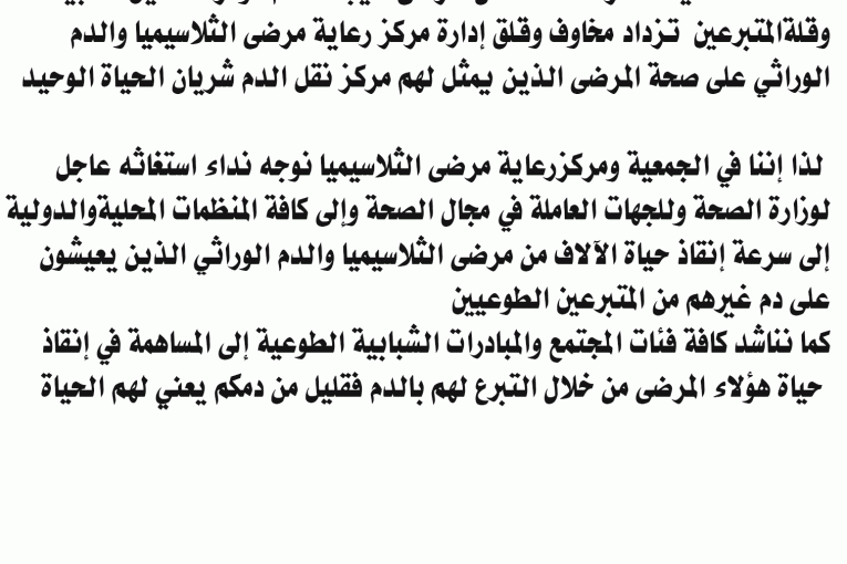 Thalassemia Center Overwhelmed with Patients – Administration Urgently Appeals to Organizations The Thalassemia and Hereditary Blood Disorders Care Center is currently overwhelmed with hundreds...