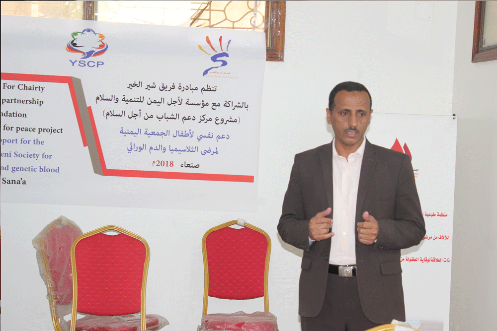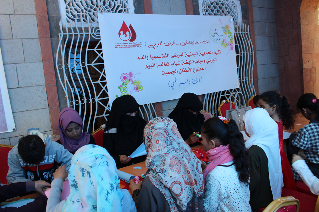 جانب من فعالية الدعم النفسي لمرضى الثلاسيميا والدم الوراثي التي نظمها بعضاً من نجوم اليمن بالتعاون مع الجمعية في مركز رعاية مرضى الثلاسيميا .